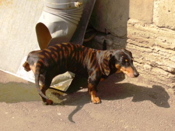 Не знаю как Вам, дорогие друзья, но мне первоначально показалось что смешно, поэтому зафотал... описание - крашеная в полосочку такса - прям как стиляга - делает свое дело не про100 у 100лба или стены - а на водо100чной трубе - как мне показалось - символично... с толком подход...