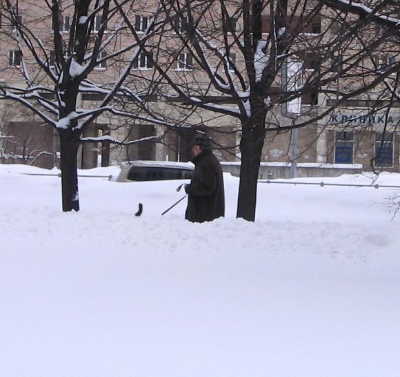 Да, я так и понял, но не хотелось пороть чушь от незнания. Так вот о шляпе. Высота сугробов, а вернее, уже высоченных собственно сугробов, засыпанных снегом с проезжей части, была еще неск. дней назад (просто я там был в начале недели, вдруг уже почистили всё!) такова, что при том же ракурсе мы бы увидели не дядечку, выгуливающего хвостик :), а только двигающуюся шляпу.