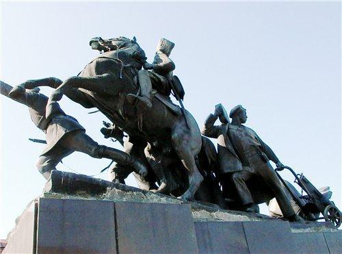 Вот "главный вид" памятника (сзади - Академия связи имени Буденного). Фигуры довольно крупные, раза в 1,5 больше реального размера... обратите внимание на самую левую фигуру (красноармеец с винтовкой) и самую правую (комиссар в кожанке) - они обе имеют только одну точку опоры (стоят на одной ноге).