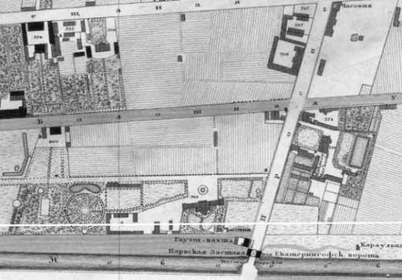 Фрагмент плана Петербурга 1828 года (план Шуберта). Нарвская застава на Обводном канале.