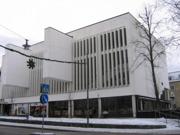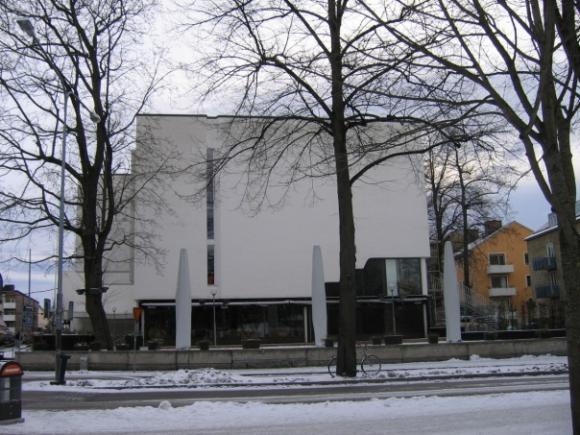 Это здание - одна из немногих (если не единственная) в Швеции работ знаменитого финского архитектора. В отличие от выборгской библиотеки, автобусов с туристами я здесь не замечал. Первоначально здание парило над землей на опорах-столбах. Шведы безжалостно отнеслись к финскому гению - в целях экономии площади нижнюю часть застеклили и устроили там магазин и ресторан.