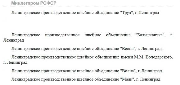 Швейные Производственные Объединения в нашем городе на 1975 год