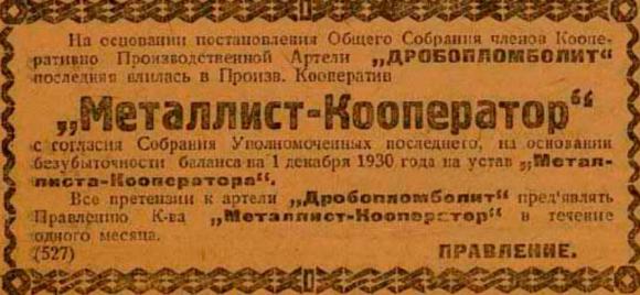 Затем в 1931 году в "Металлист-Кооператор" вошли ещё артели: Термос,Пломба-Медь,Дробопломболит