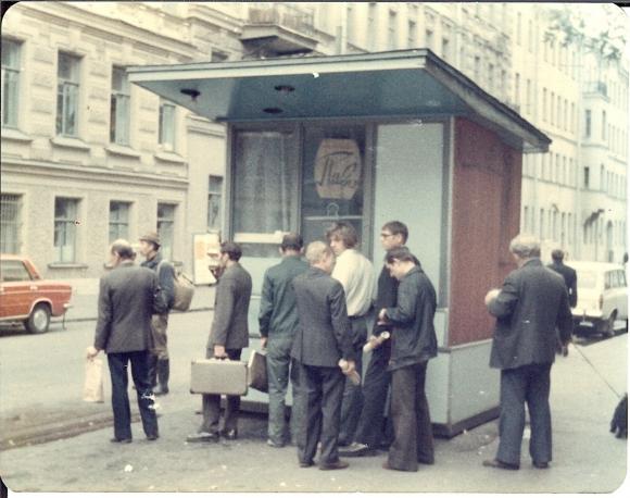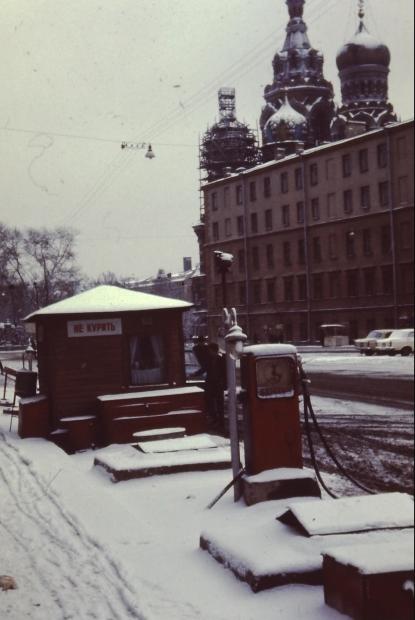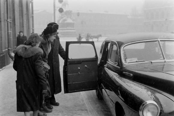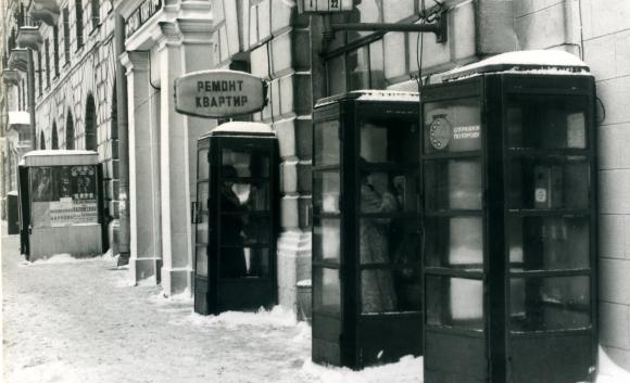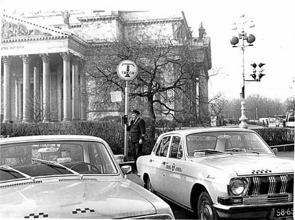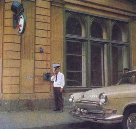 Телефонный аппарат, который размещался на стоянках Ленинградского такси. Аппарат по которому разговаривает водитель (внизу) был обычным. А вот наверху висела специальная коробка. В ней было установлено реле, которое при поступлении звонка по телефонной линии включало лампу на 220 В, которая была установлена в специальном, защищённом от дождя и снега светильнике с буквой "Т", т.к. звонка на улице то не слышно В случае загорания лампы водитель первой машины был обязан подойти, взять трубку и ответить диспетчеру.