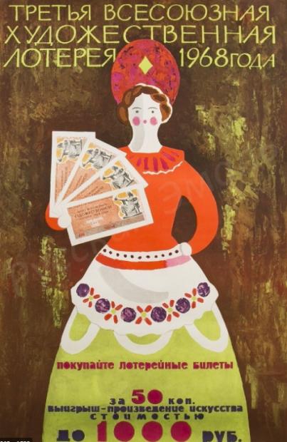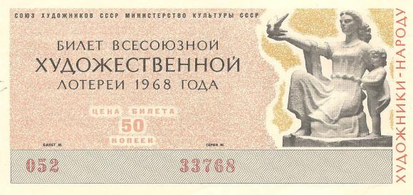 Третья художественная лотерея проходила в 1968 году. Вот рекламный плакат и билет: