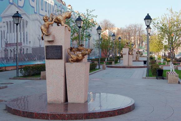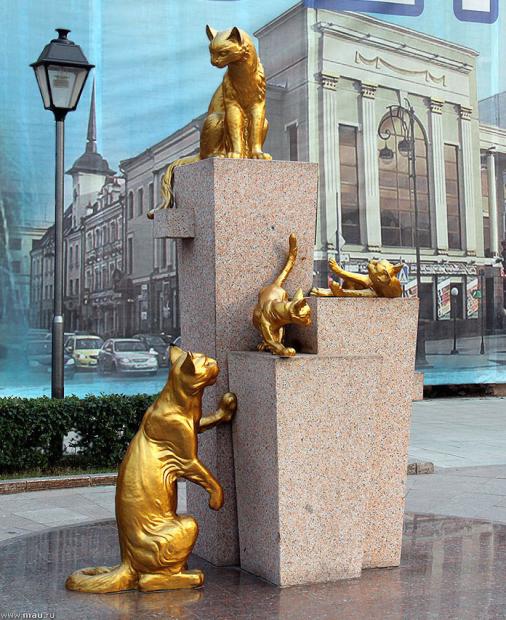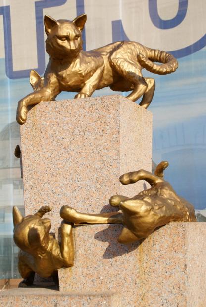 На постаментах таблички - там краткие сведения о кошках сибирской породы и весьма пафосное изложение истории.