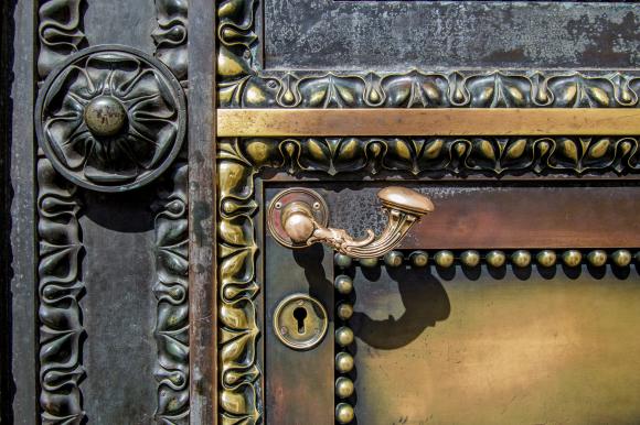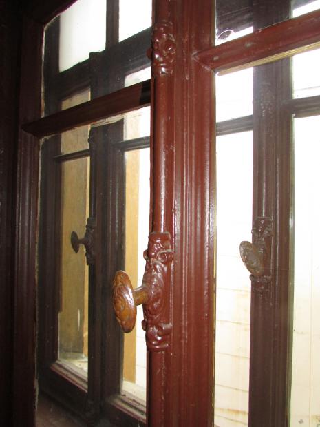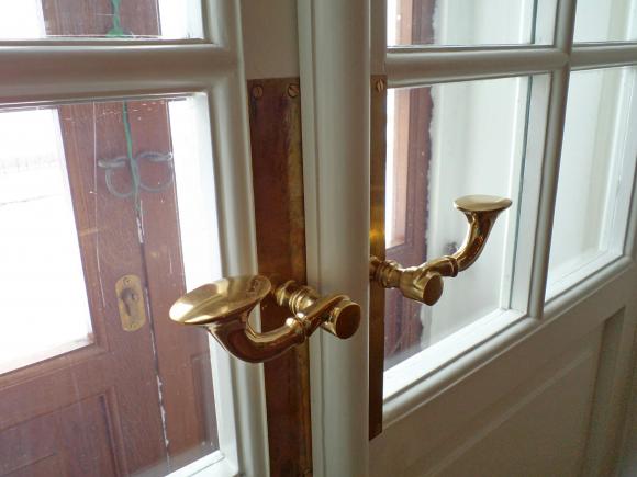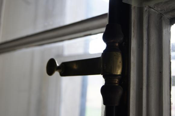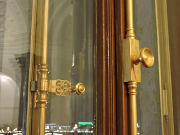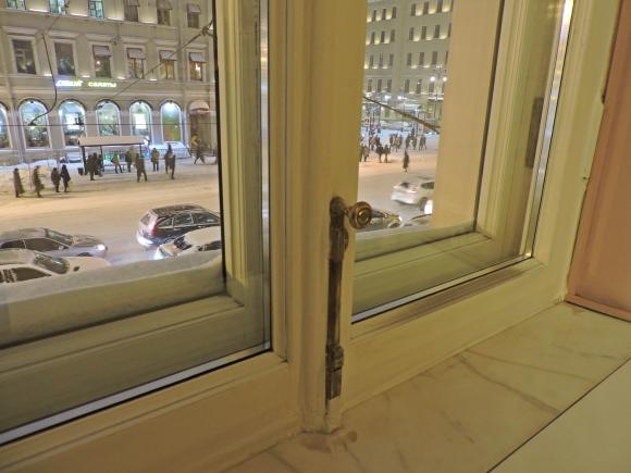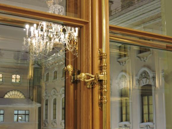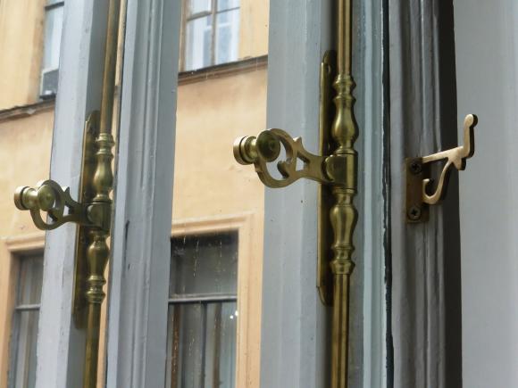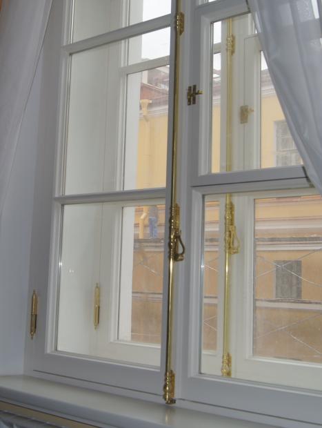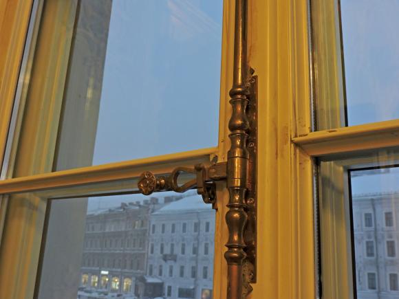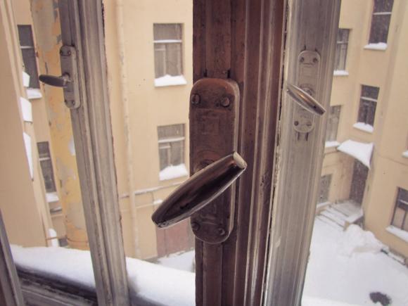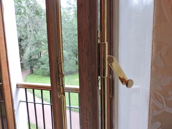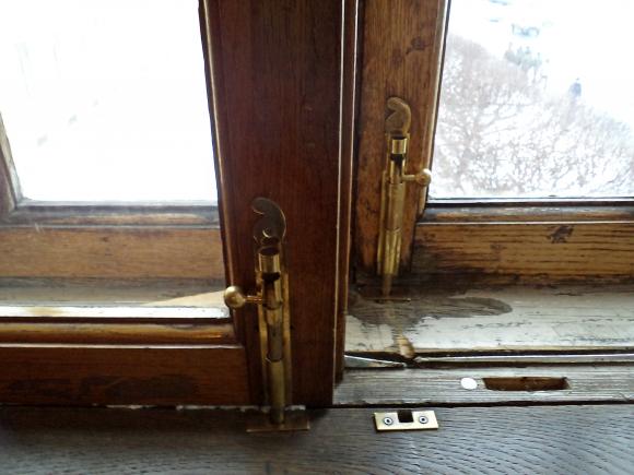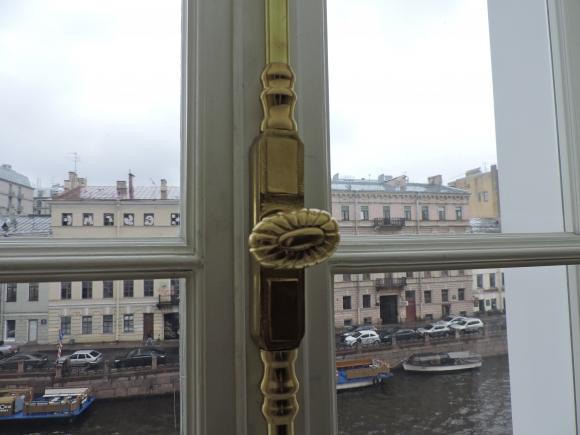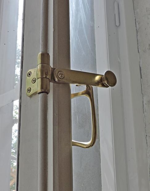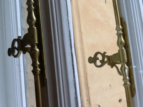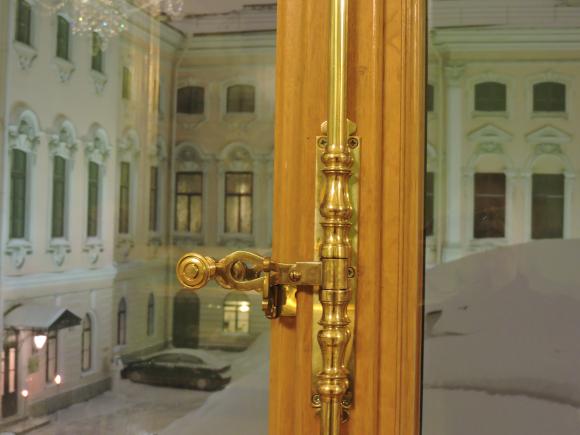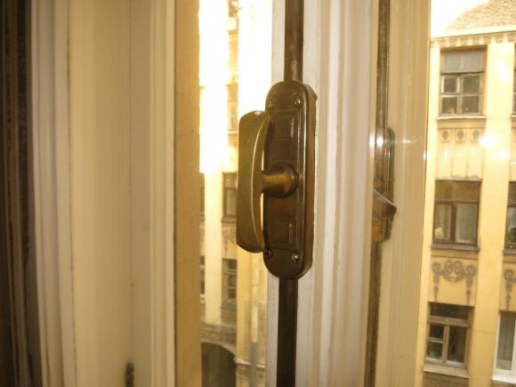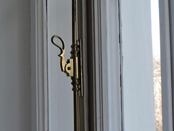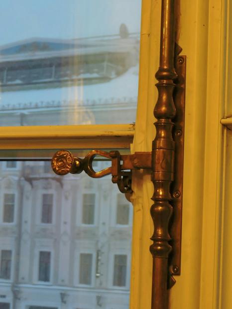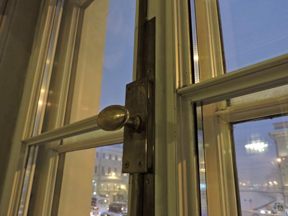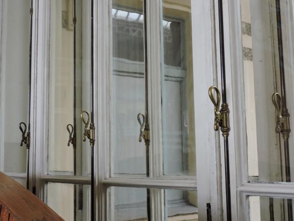 Такие ручки и механизмы сохранились на многих окнах парадной лестницы.