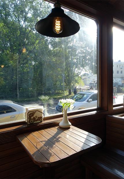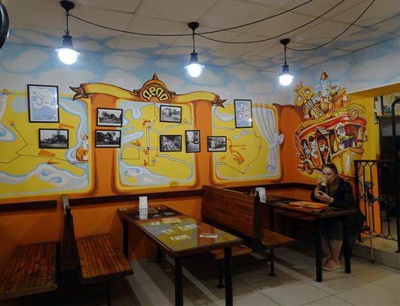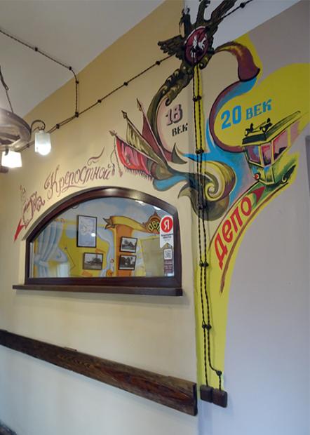Стены обоих заведений интересно расписаны. В пирожковой обыграна тема выборгского транспорта и в частности трамвая. На стенах размещены старые фотографии