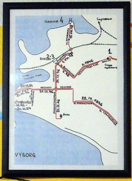 На этом стенде кратко изложена история выборгского трамвая. Действовал он в 1913-1957 гг. Линии строились в 1912 г. Все материалы под стеклом, фотографировать сложно, да с моим зрение без фотоаппарата я бы это и не прочитала :(