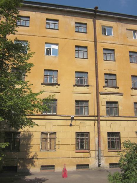 Архитектура  этого здания совсем не похожа на помпезную "декорированную резьбой шкатулку" лицевого фасада жилдома N69. Здесь внешняя отделка, как и подобает дворовым флигелям с дореволюционных времен, очень скупая. К зданию примыкает 2х этажный клуб с совершенно конструктивистским  закруленным ризалитом.