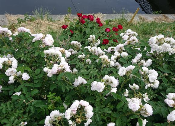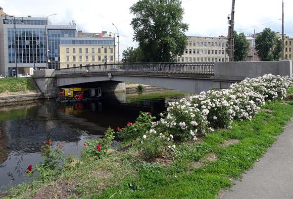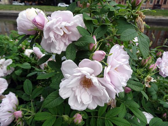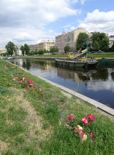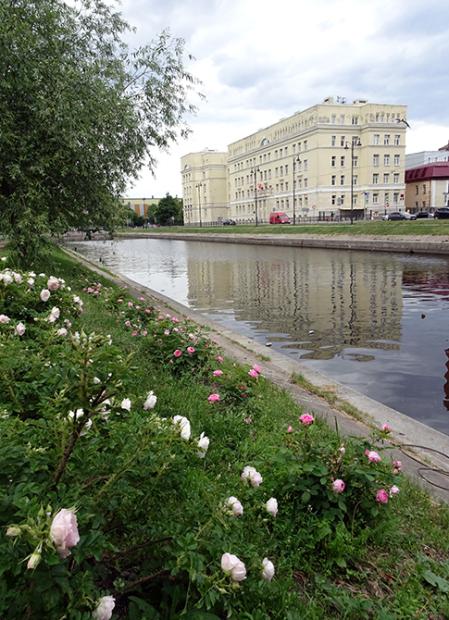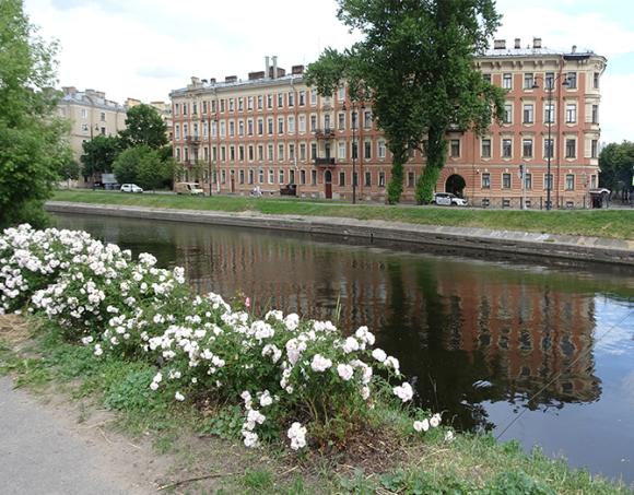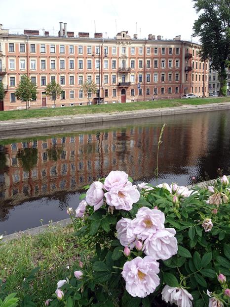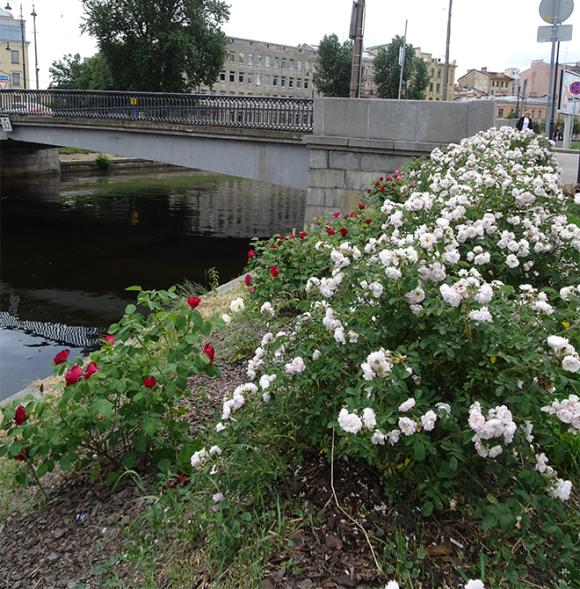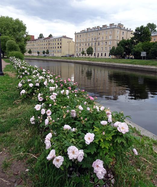 Здесь, напротив дома Блока махровые шиповники, а ближе к воде, вторым рядом розы