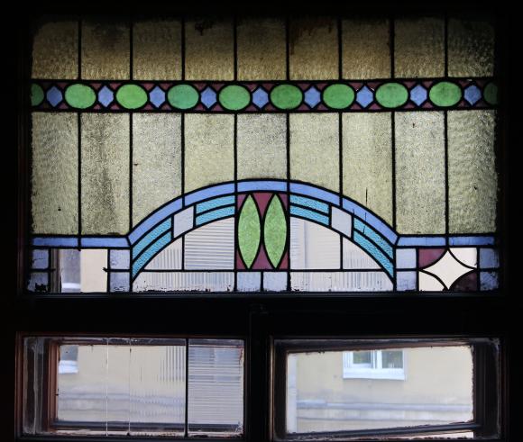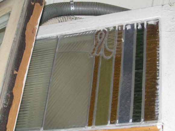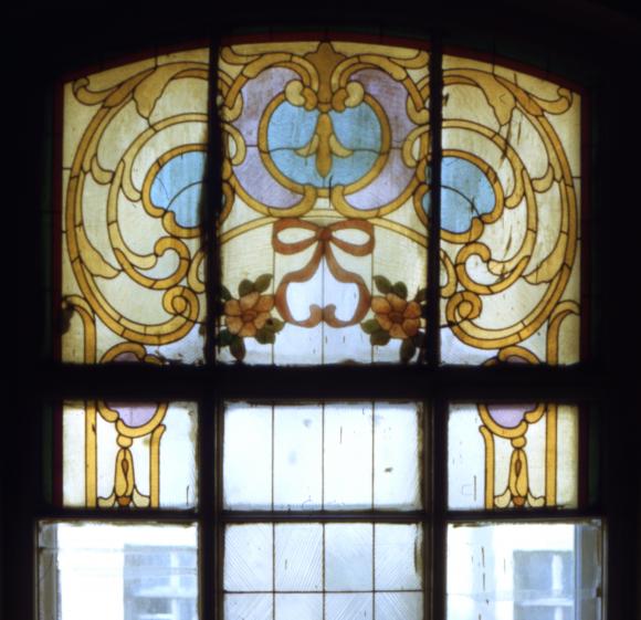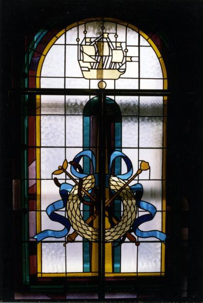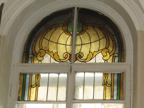 Галерная ул., 24 Адмиралтейский филиал Промстройбанка. Витражи на лестнице. 1992 г. Автор Евгений Иванов, сборка-фирма Омега-м. Утрачены при ремонте и заменёны другими.