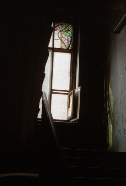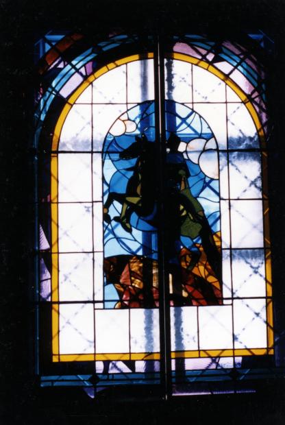 А вот со слайда более 20-ти летней давности... более точно-фото 1992 года. А ещё более точно-январь-февраль 1993 года :-) или январь-февраль 92-го, уже засомневался, помню был солнечный день, пошёл фотографировать витражи после тёчной зимы... Фотоаппарат был с разъюстированным объективом. 1992-го всё-таки скорее.