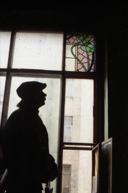 Витражист Ю. А. Билибин на фоне старинного витража. Фото Е. Иванов, середина 1990-х.
