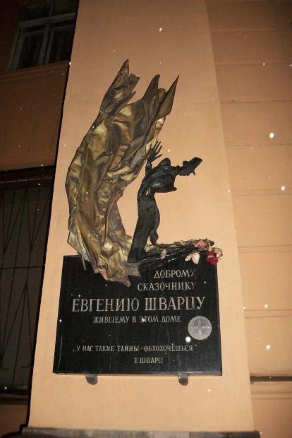 Последний (Александр Дымшиц) в своих заметках вспоминал соседей - Евгения Шварца и его жену: "С 1955 г. мы жили с Шварцем, что называется, под одной крышей, в новом доме на Петроградской стороне. Евгений Львович и Екатерина Ивановна поселились в небольшой и очень уютной квартире второго этажа. По странной причуде архитектора окна этой квартиры выходили на своего рода площадку, с которой поднимались ввысь массивные колонны. "Живу, как в Афинах, - посмеивался Шварц. - Вы не видели меня утром? В сандалиях, в тоге, со свитком в руках, украшенный лавровым венком, я шествовал между колоннами и спорил с киниками из "Ленфильма", - имя же им - легион"».