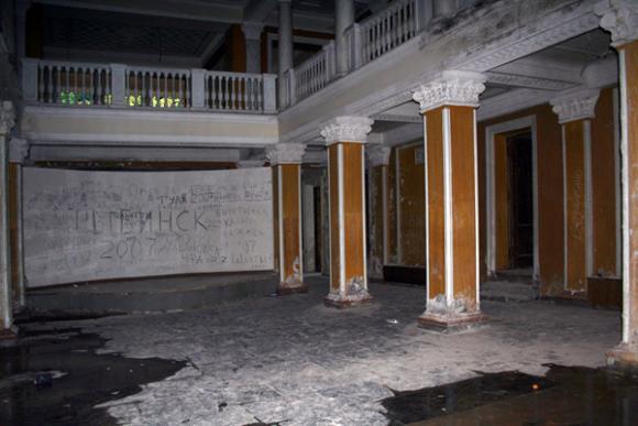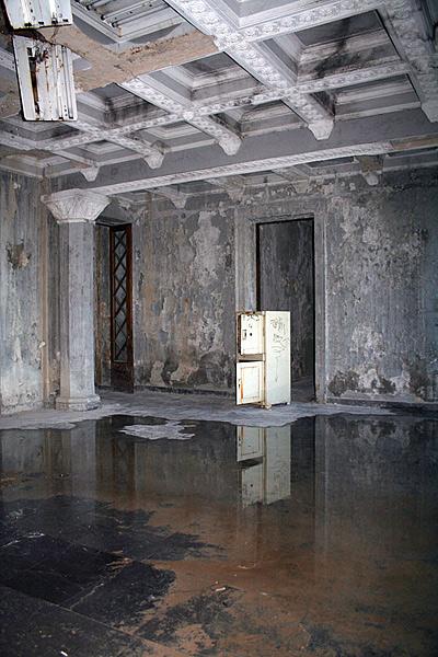 И театр - почти иллюстрация из "Сталкера" Тарковского: раскрытые настеж двери, текущая откуда-то сверху - совершенно непонятно откуда! - вода, в полной тишине капли гулко ударяют по поверхности, раскрытый сейф, сцена, занавес, кресел нет, зал пуст...