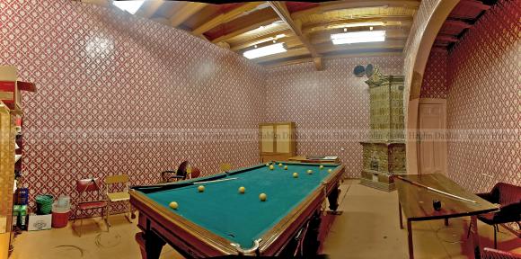 Пройдя по длинной изогутой галерее,подозрительно напоминающей зимний сад,попадаешь в бильярдную,где действительно стоит... он самый.Как сто лет назад: