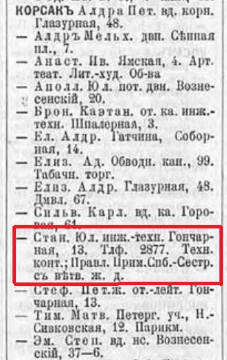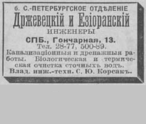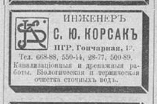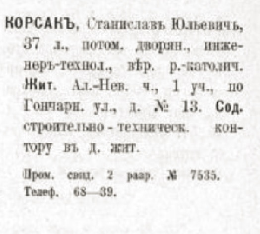 В 1911 году Станислав Юльевич Корсак выкупает Строительную контору у Польских инженеров Држевецкого и Езиоранского,становится вновь её Владельцем и переименовывает Контору в "Инженер С.Ю.Корсакъ" на Гончарной ул.13