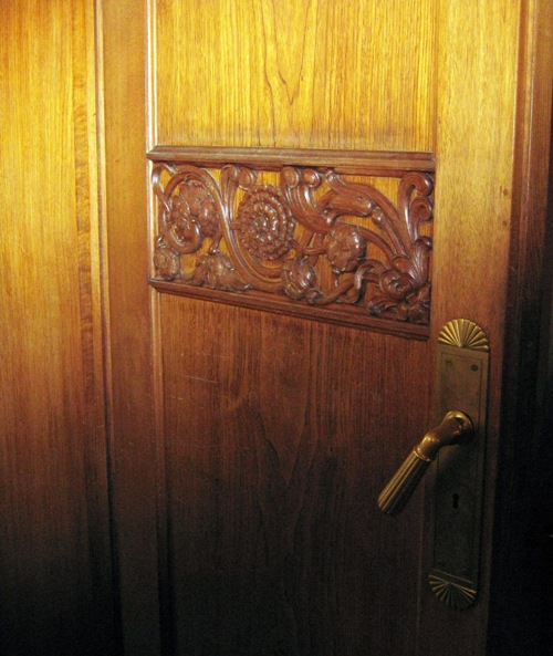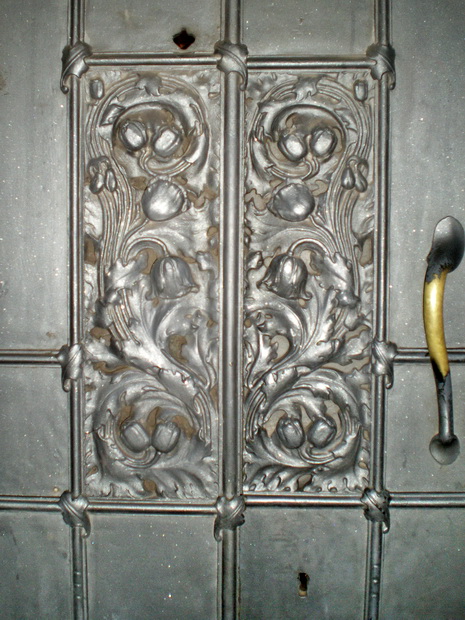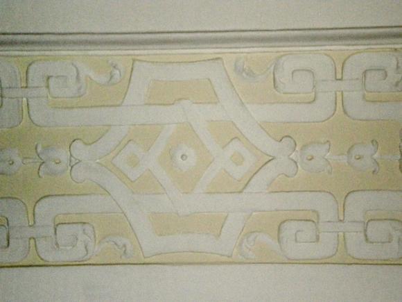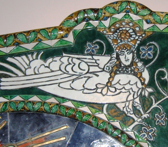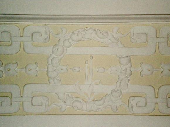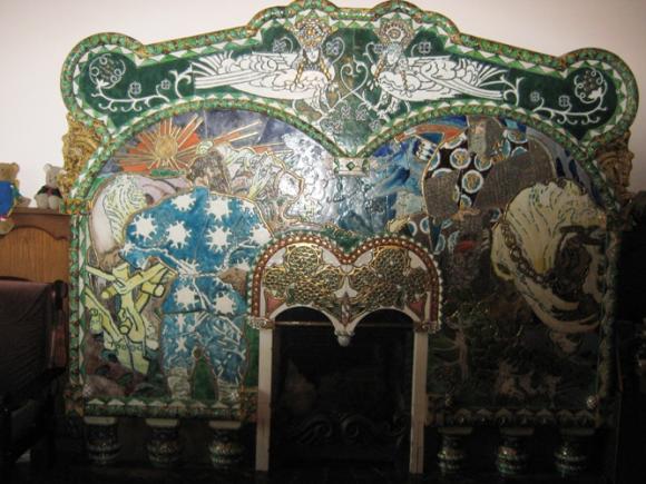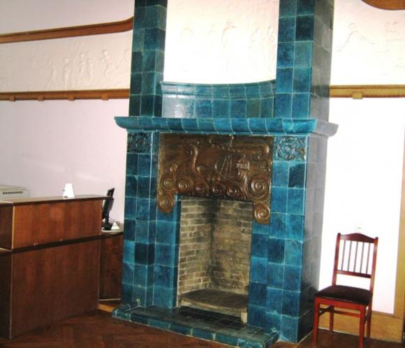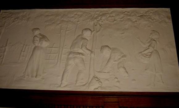 Наталия, может, Вы имеете в виду потолок, выполненный в технике намазной лепки (так, кажется, это называется)? Это в комнате рядом с лестницей, где камин с изображением корабля-дракара и наверху 2 барашка, и 2 барашка на потолке, кстати; и рельефы на темы крестьянской жизни по стенам. Фамилию скульптора тоже, к сожалению, не запомнила.