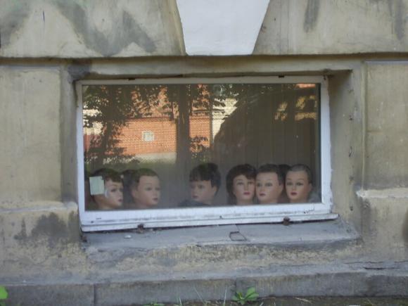 Человеческие головы - это где? Нарвский, 31? С фасада или во дворе? И что за кирп. здание отражается? Или это не отражение?