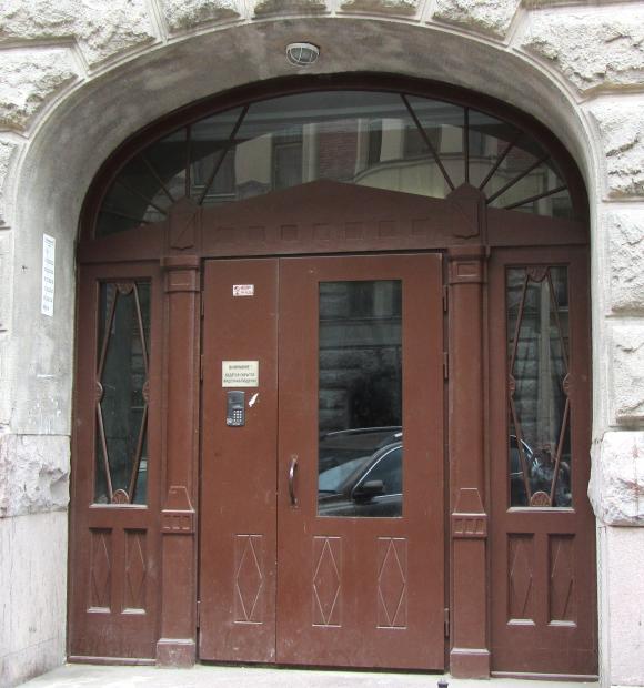 Дверь квартиры на верхнем этаже украшена знаком страхового общества