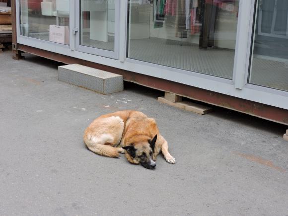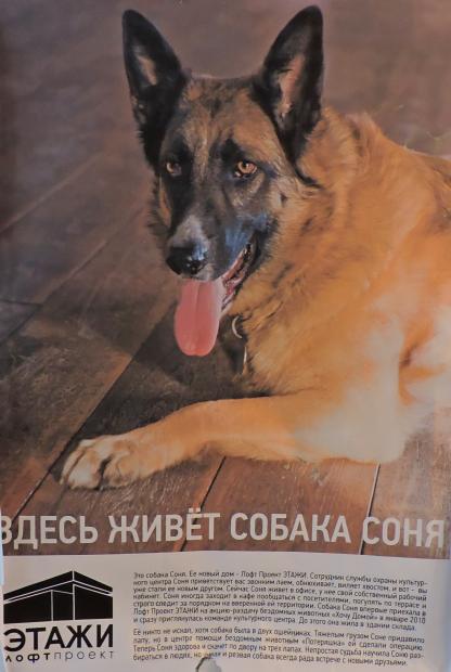 Собака Соня - сотрудник службы охраны культурного центра. Впервые Соня приехала в Лофт Проект Этажи в 2010 году на акцию-раздачу бездомных животных "Хочу Домой" и сразу приглянулась команде культурного центра. Сейчас Соня живет в офисе, у нее свой собственный рабочий кабинет. До этого она жила в здании склада. Соню никто не искал, хотя собака была в двух ошейниках. Тяжелым грузом ей придавило лапу и в центре помощи бездомным животным "Потеряшка" ей сделали операцию. Соня поправилась и строго следит за порядком на вверенной ей территории. Иногда она заходит в кафе пообщаться с посетителями, погулять по террасе.