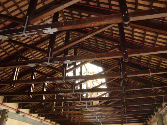 Интересное инженерное решение крыши. Стропила деревянные, не скрытые потолком, сами по себе великолепное зрелище.