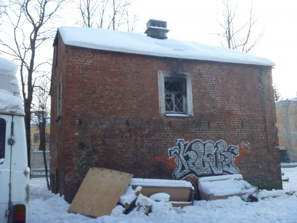 Похоже, что этот домик был более нарядным, его упростили, когда латали красными кирпичами...